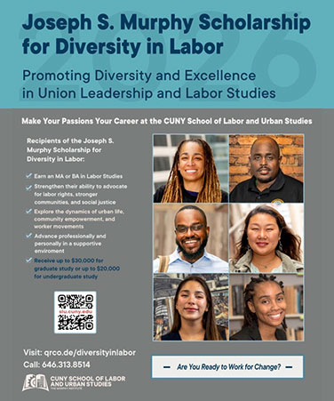 Each year since 2013, the City University of New York has supported the Joseph S. Murphy Scholarship for Diversity in Labor by providing an annual challenge-grant. The CUNY School of Labor and Urban Studies raises matching funds annually with donations from generous individuals and organizations representing various sectors and professions, including labor unions, academia, non-profit organizations, and businesses. The scholarship was designed to create pipelines that will bring underrepresented individuals to the forefront of the labor movement and labor education. Each year the CUNY School of Labor and Urban Studies will award up to $150,000 in scholarships to qualified applicants, both at the graduate and undergraduate levels.